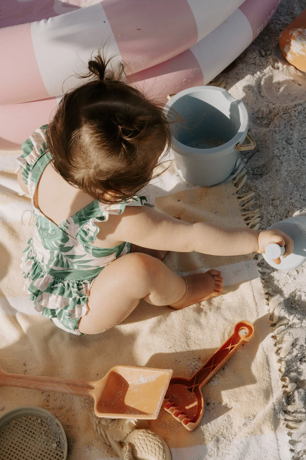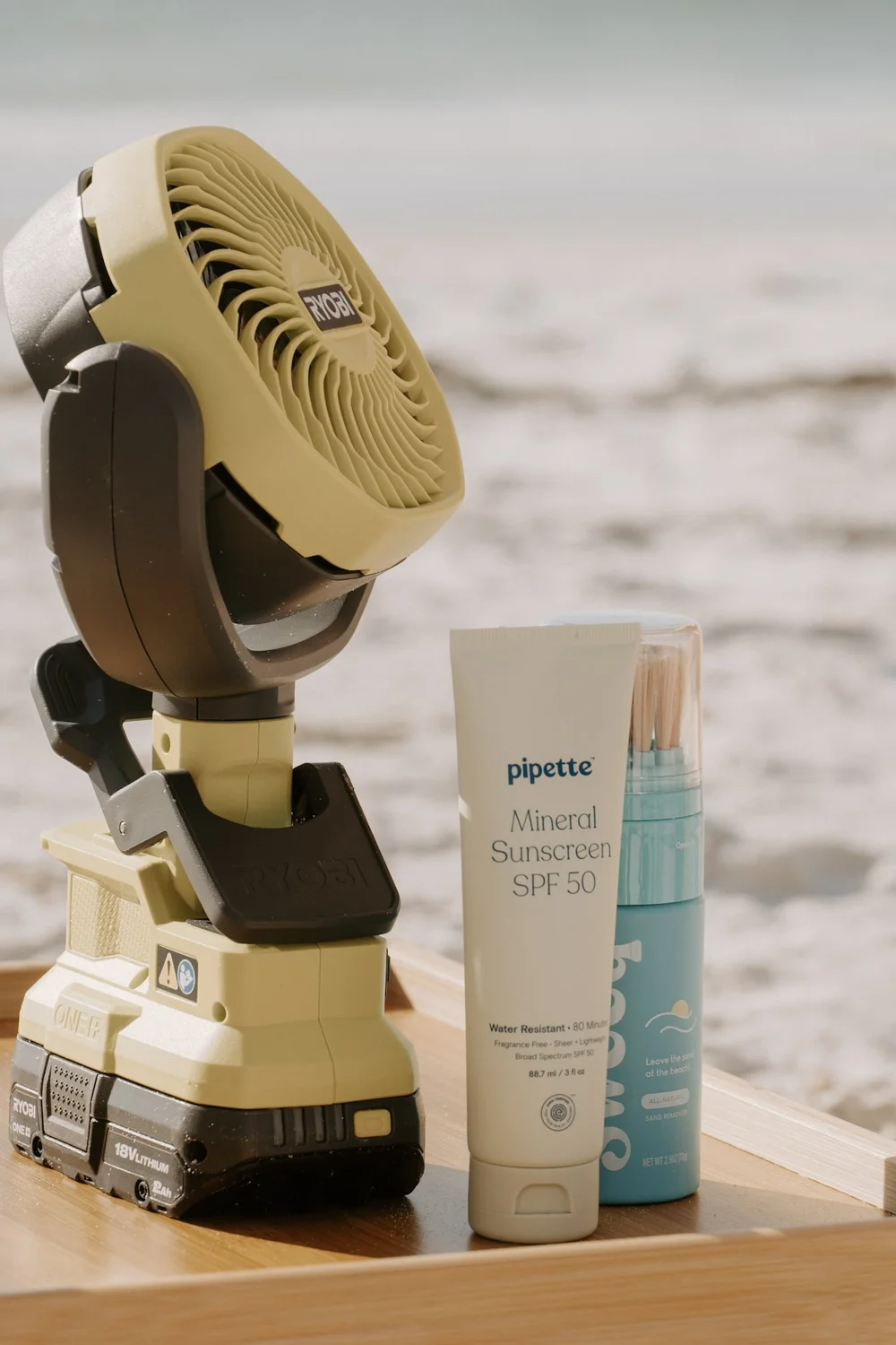The muslin beach poncho, sunscreen and sand removal tool are yours to keep.